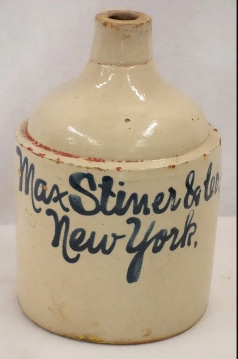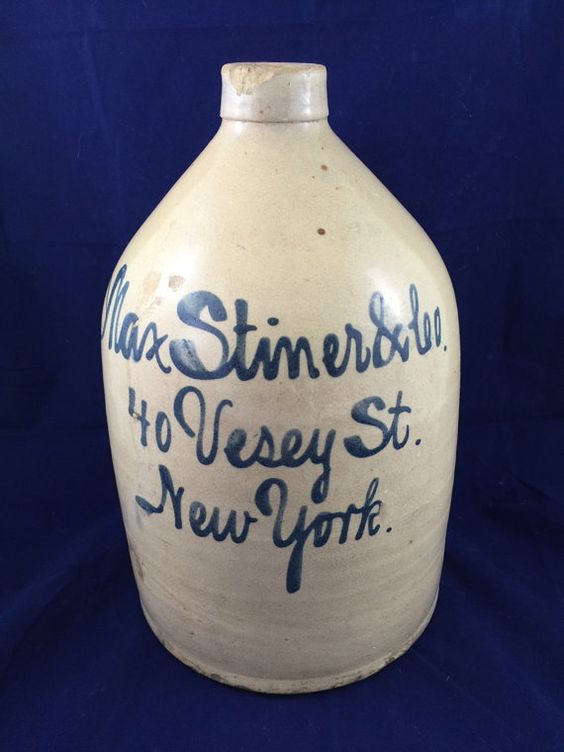 By 1894, Stiner apparently had decided that his “cup of tea” more likely was a shot of whiskey and had opened the liquor store on Vesey Street. He was dealing in both retail and wholesale goods, the latter sold to the many saloons, hotels and restaurants that dotted the Manhattan landscape. He was receiving wines and liquors by the barrel and decanting them into smaller vessels. Stiner’s jugs were of a quality to draw attention to his establishment. In sizes up to five gallons, he provided his wares in salt-glazed stoneware containers with his name written in large cobalt script. Shown throughout this post for their variety, these jugs would have been emptied by his customers into smaller vessels for pouring over the bar.