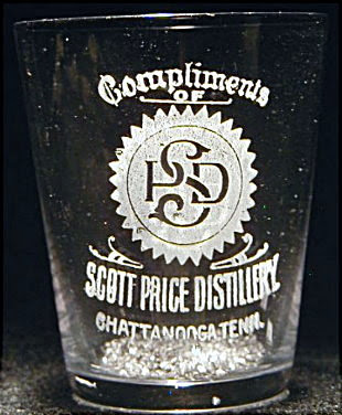 Note: Gathered from a variety of sources, this post owes the most to Tom Carson (tcarson@ewkm.net) for an Internet article on the Scott Price Distillery. Modestly he says: “This article is not a scholarly article with all the footnotes, but is an attempt to add a little information to the history of liquor in Chattanooga.” Additional information and photos of Price’s shot glasses are from Robin Preston’s pre-Pro site.