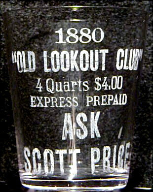 When Georgia and other Southern states went dry in 1908-1909, it was a bonanza for the Chattanooga liquor houses. As a major American railroad center, trains rolled daily out of the city bound for the “dry” South. They were known popularly as “jug trains” because of the liquor they carried. Scott Price was quick to seize the opportunity. Like many whiskey men, he issued advertising shot glasses clearly aimed at the mail order customer. Four quarts of Old Scott Corn could be had for $3.00 and the express cost was prepaid. Scott’s Pure Malt prepaid sold for $3.90 for four quarts. Old Lookout was $4.00.