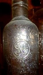 Scott also was selling bottled goods under his own name. Shown above are two embossed bottles of his whiskey, a cobalt half pint mini-flask and a clear bottle of similar size. Both bear the name Scott Price Distillery and a monogram of the liquor dealer’s initials. Below is a labeled pint flask advertising “Old Scott Corn Whiskey.” Other house brands were “Scott’s Pure Malt,” “Old Lookout Club” and “Lookout.” None were ever trademarked.