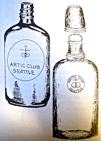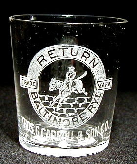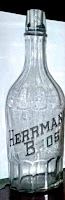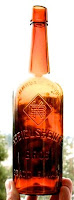 Shown here is a pint bottle that proclaims the barrels as “Our Sign” Below are quart bottles bearing Mark’s embossed label design. It involved three stacked barrels with a bird perched on top below the word “purity.” The bottom barrel is split with a disembodied hand stretching out with a glass. The rear of the bottle is embossed: “J. C. Marks Liquors…Wholesale Liquors…Guaranteed Full Measure” and the address at the base. Filled with whiskey, the barrels would show as red, a truly interesting package.