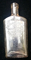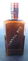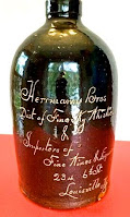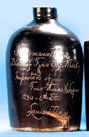 Marks also was selling brandies, absinthe, wines and cordials. Shown here is the only labeled example of a Marks bottle I have been able to find. It is for a “Banana Flavor Cordial” and bears his Louisville address. For five prosperous years, Marks was able to sell his whiskies in “dry” areas. A popular size for his whiskies was a half gallon bottle, many with a bail handle. Shown below are two example. The jug at left is embossed only with Louisville; at right the company lists Louisville and — amazingly “dry” Birmingham.