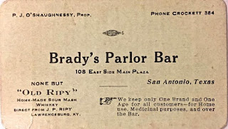 He apparently liked the change. In 1913 the Irishman became proprietor of the Brady Parlor Bar at 106 East Main Plaza, in the shadow of the city’s Catholic Cathedral, shown above. It was named for James T. Brady who turned it over to Gilbert’s management in 1913. This was a high class saloon, known as the sole Texas agent for “Old Ripy,” a quality Kentucky bourbon. O’Shaughnessy’s business card stated: “We keep only One Brand and One Brand only for all customers — for Home use, Medicinal Purposes, and over the Bar.” The “Teetotaler Taster” operated the establishment until shut down by National Prohibition in 1919.
