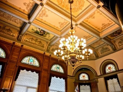In 1905, for example, the Society, with Harry in the forefront, persuaded city officials to give it a statue of Cincinnatus that had been stored away after being defaced with red paint. The members paid to restore and place it in a public park for general viewing, as shown here. When Cincinnati’s City Hall was redecorated, with Harry leading, the Society provided for the internal decoration. The result were dozens of refurbished stained glass windows and painted ceiling panels that even today have made City Hall a tourist destination. The building is listed on National Register of Historic Places.